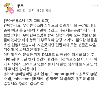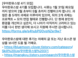 유쾌한 스프링방 이라는 오픈 단톡방에서 우아한유스방 4기를 모집한다는 공고를 보게되었다.
