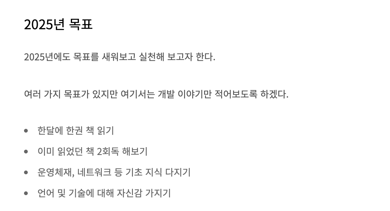 지난해 회고를 다시 펼쳐 보며 그때 세웠던 2025년 목표를 점검하고, 이를 바탕으로 한 해를 돌아보고 새로운 목표를 정리해보고자 한다.