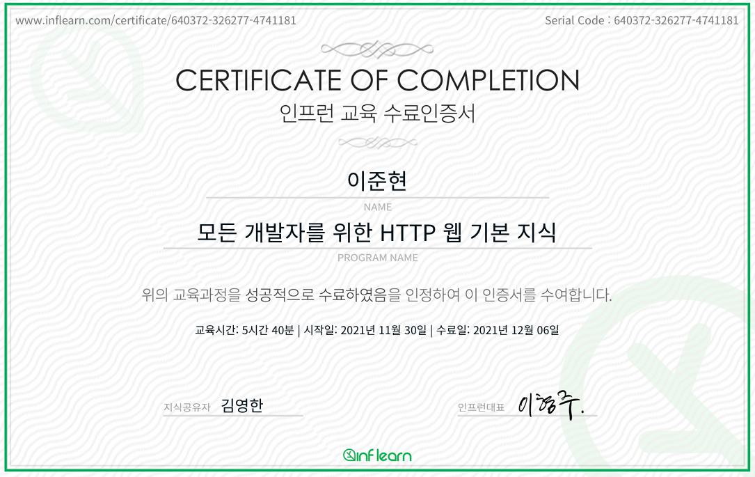 혹시 저처럼 HTTP 공부를 망설이고 계신다면 김영한 님의 모든 개발자를 위한 HTTP 웹 기본 지식 강의 강추 합니다!