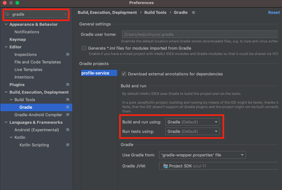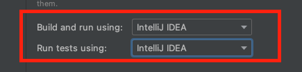 해당 설정을 Gradle이 아닌 IntelliJ IDEA로 변경합니다.